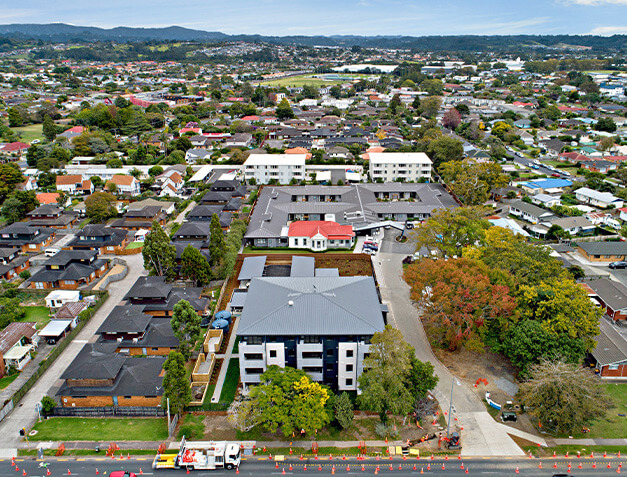 Aged care facility located in Hobsonville Point, comprising four blocks, standing up to four-stories high.