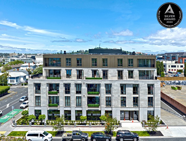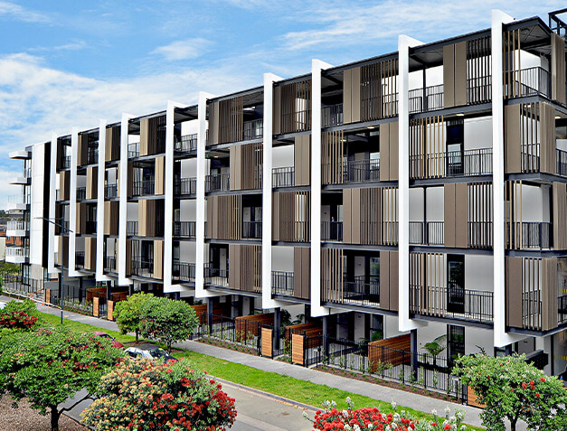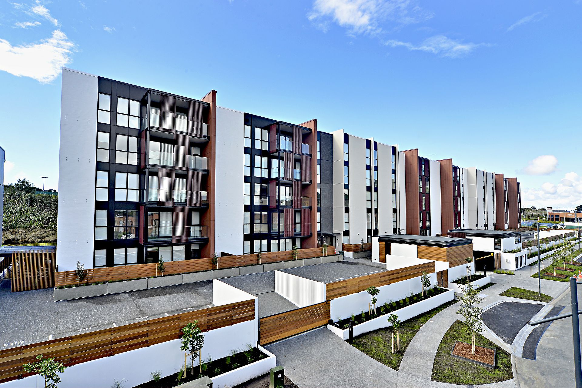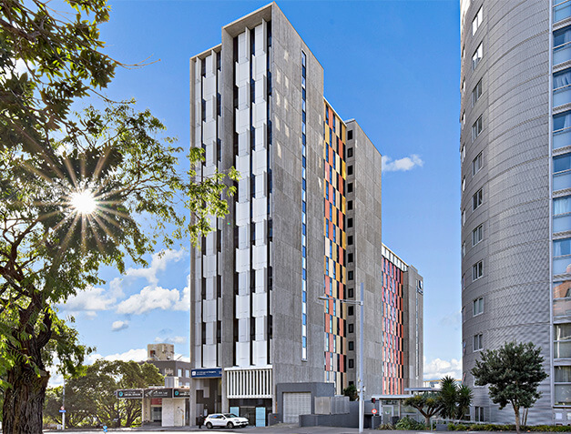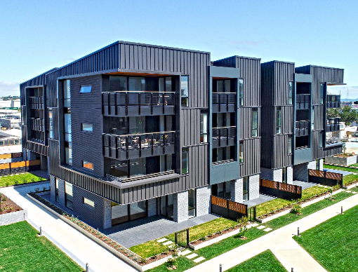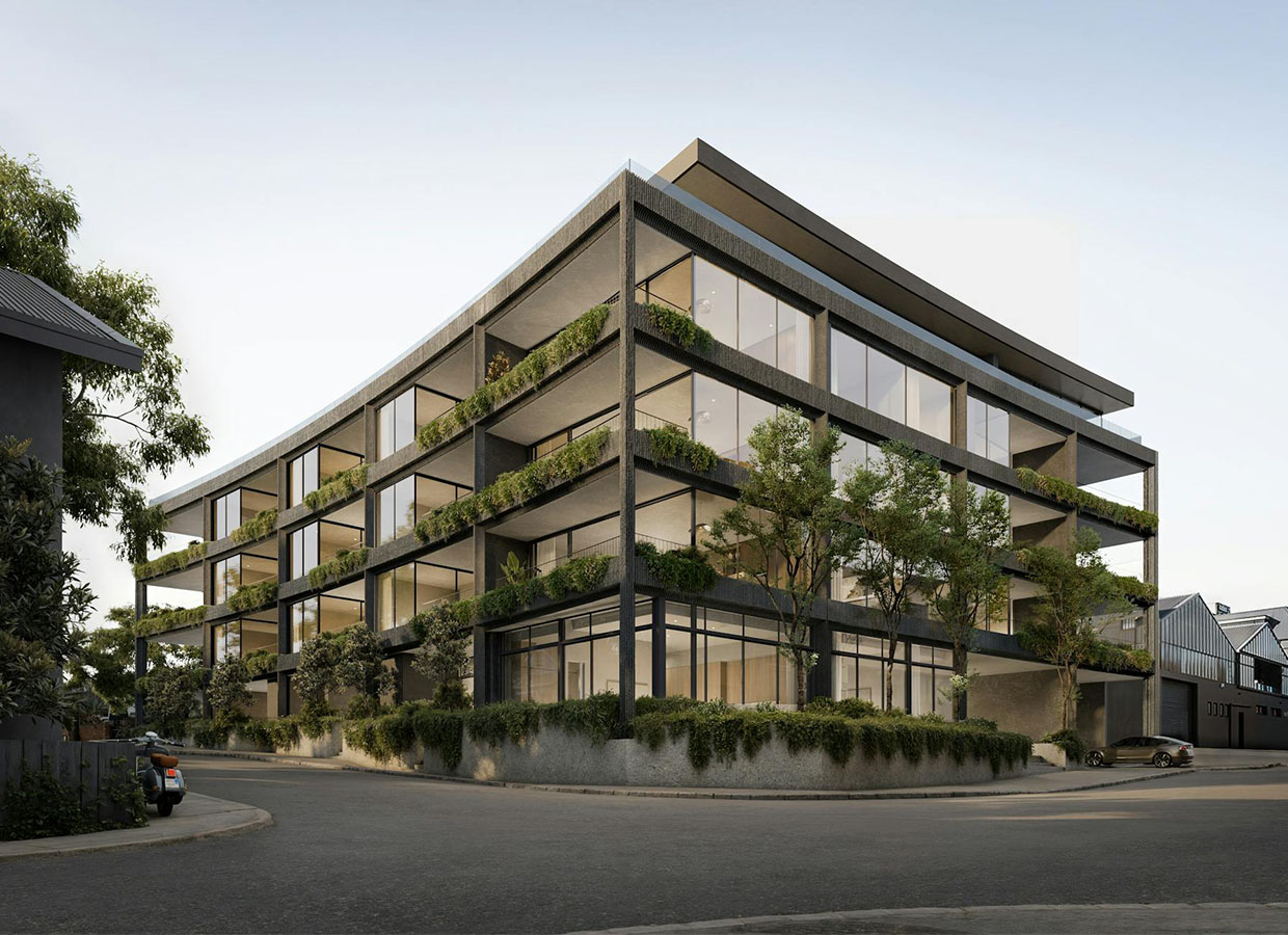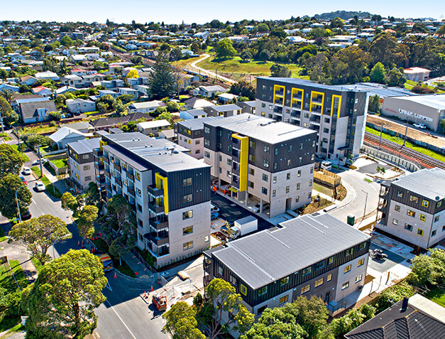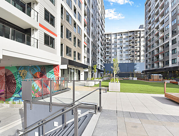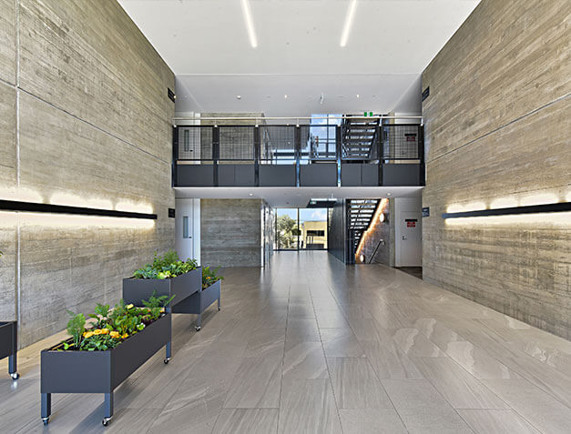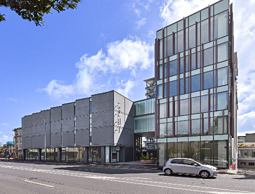 Three buildings, all four stories high that are constructed over an elevated podium. Basement with lift cores to service each building.