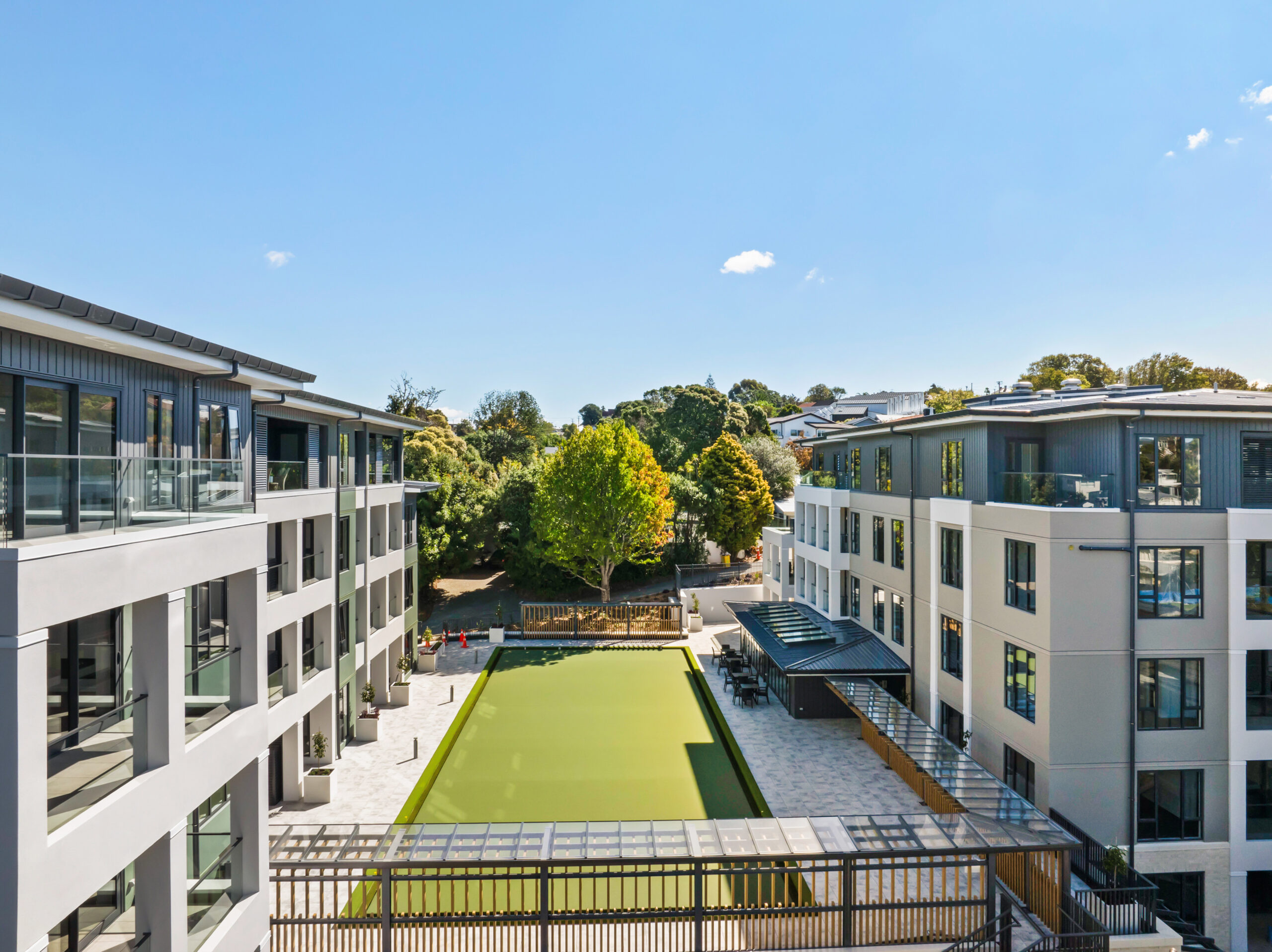 Fifty-eight retirement apartments spread over two five storey buildings. Combined basement carpark, and combined podium between two buildings with a bowling green and connection to existing retirement village walkways.